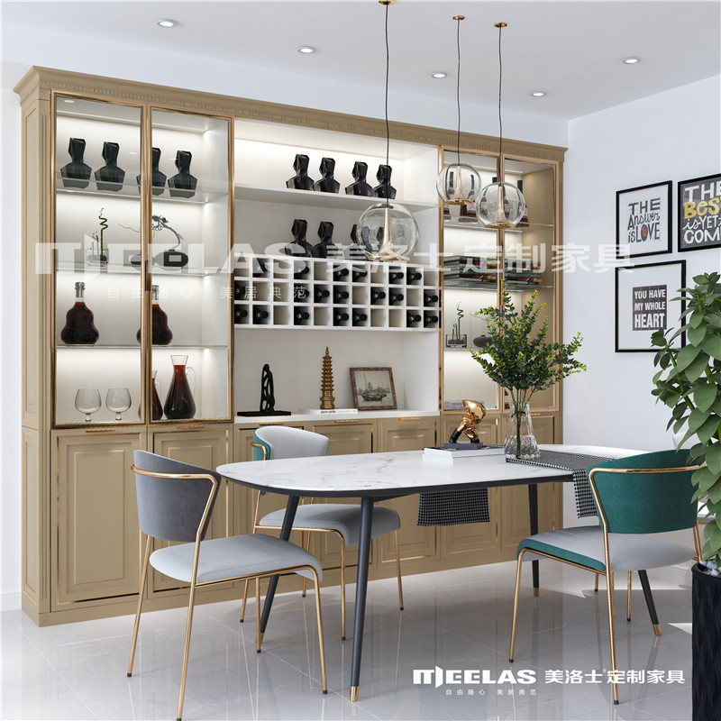 餐边柜高深工艺铸就高雅的外型,给餐厅增添豪华元素,同时配以轻奢餐桌椅,既有复旧的气概又有古代的气味,在这就餐、品酒便是一种享用。