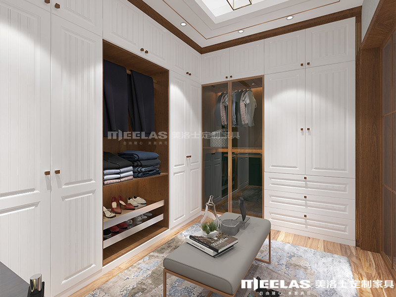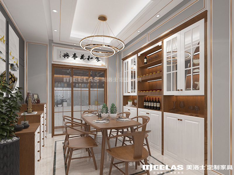 以金丝樱桃板材设想为主色采,美洛士白门板装点,取其精华,豪华贵气,与肃静严厉娟秀相连系,打造新中式轻奢主义气概