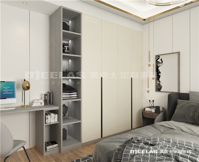 主卧(wo)室橱柜(ju)工作(zuo)设想一柜(ju)到顶(ding),很大束缚地建设ꦡ收纳技(ji)巧(qiao)地方,侧边(bian)留空展示(shi)出区,主体发光字的LED灯(deng)装潢,个性稳重而极简(jian)风。