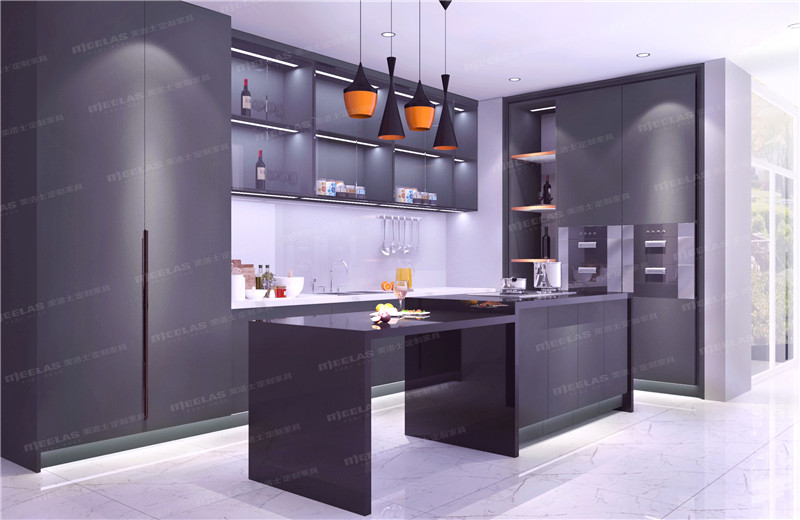 这款橱柜设想将收纳应用到极致,地柜按照收纳需要朋分成多个单位柜,墙壁做满双层吊柜,收纳功效非常丰硕