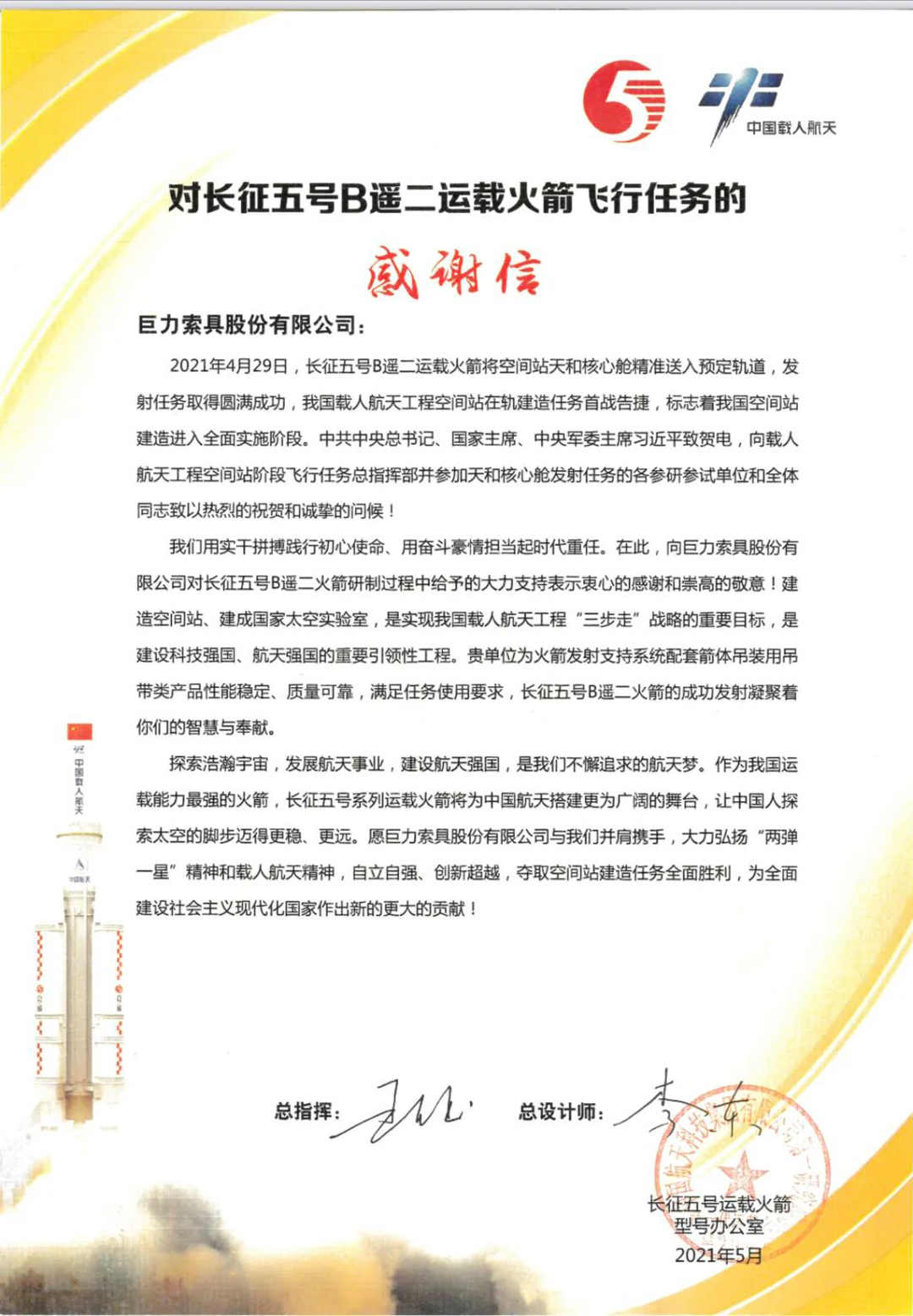 漫谈会上,两边就航天产物的吊装计划、将来大型火箭的吊装、吊具的通用化设想和无吊点吊装等智能化装备停止会商。巨力索具凭仗屡次为神舟飞船系列、嫦娥系列、长征运载火箭系列、天宫系列、天问系列供给定制吊装产物及吊装计划的理论经历赐与专业回答。都城航天表现感激并对巨力索具在航天范畴的专业性、立异性表现承认。